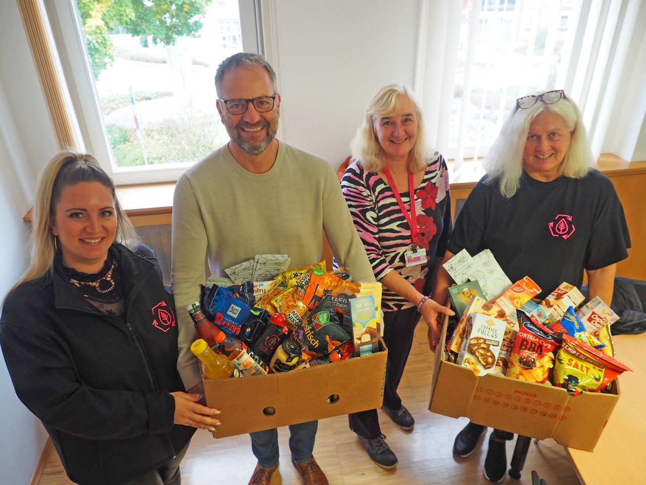 Zwei Kisten voll mit Lebensmitteln – Schokolade, Chips, Nudeln und vieles mehr – haben kürzlich den Weg ins Uhinger Rathaus gefunden. Verena Manz und die beiden Uhingerinnen Heidi Hönes sowie Sabine Wenzel vom Verein FreeFood brachten die Kisten kürzlich zur Stadtverwaltung, um zu zeigen, wie viele Lebensmittel ohne das Bestreben der Vereinsmitglieder im Müll landen würde. „Und das, obwohl sie noch genießbar sind“, betont Verena Manz, die die Aktivitäten der Lebensmittelretterinnen und -retter im Landkreis Göppingen koordiniert.