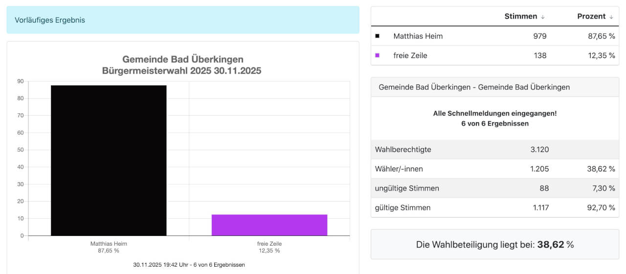 Matthias Heim ist als Bürgermeister von Bad Überkingen im Amt bestätigt worden.