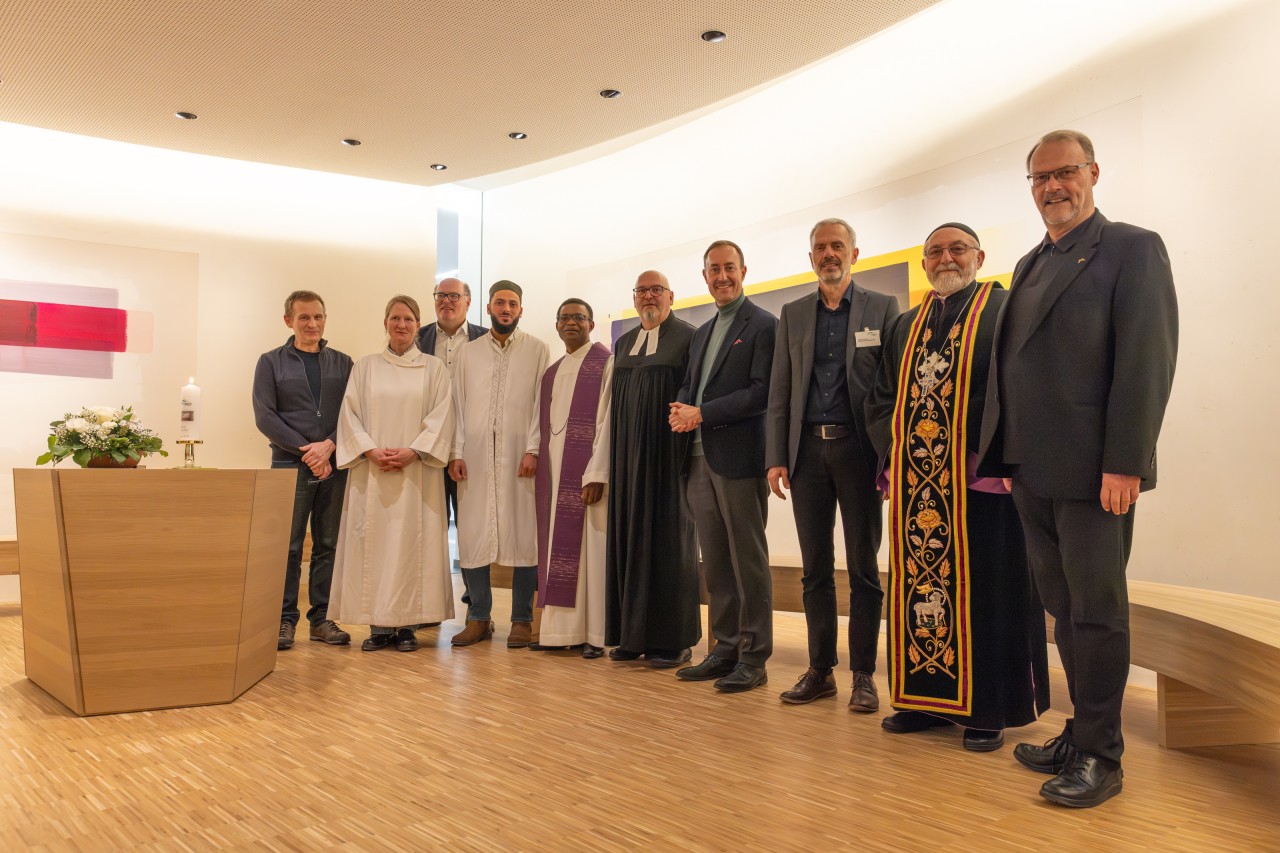 In ihren Grußworten würdigten Wolfgang Schmid, Kaufmännischer Geschäftsführer des ALB FILS KLINIKUMS, und der Künstler Bernhard Huber die große Bedeutung eines Ortes, der Menschen unabhängig von ihrer religiösen Zugehörigkeit offensteht. Die Krankenhausseelsorge, vertreten durch Pastoralreferentin Sonya Schmid-Richardson, Pfarrer Achim Esslinger und Pfarrer Leonard Lemchukwu sprachen zusammen mit Pfarrer Habip Önder von der syrisch-orthodoxen Gemeinde und Mehmet Sahin vom DITIB Türkisch Islamischen Gemeinde zu Göppingen e.V. anschließend ein gemeinsames Gebet sowie Fürbitten für Mitarbeitende, Angehörige und Patienten. Musikalisch wurde die Veranstaltung von Kirchenmusiker Norbert Englbrecht am Klavier begleitet.