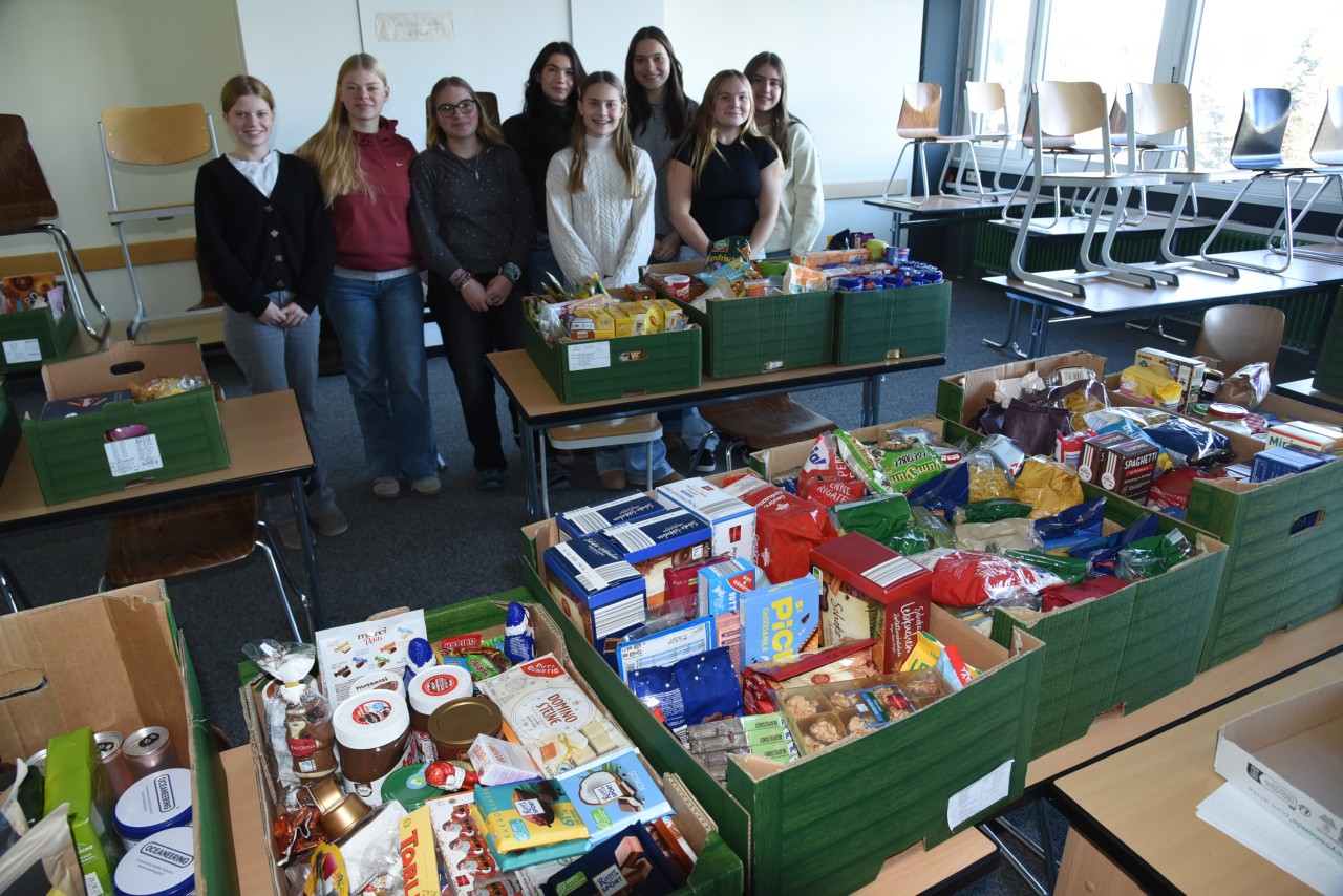 Holzweißig, die die Spendenaktion begleitet hat. Es hat gut funktioniert. Die „Werbung“ auf dem Instagram-Kanal der Schule ist bei den Schülern angekommen, per Elternbrief im Schulmanager haben auch die Eltern der Schüler „Wind“ von der Aktion bekommen. Und die Taschen ihrer Kinder vollgepackt. Kartonweise Nudeln, kleine, große, breite, lange. Und Lebkuchen in Hülle und Fülle, Marmelade, Schokolade, gläserweise Nuss-Nugat-Creme und Kaffeefilter für den Adventskaffee. Holländische Sirup-Waffeln, Konserven-Dosen, Shampoo, es war alles dabei.