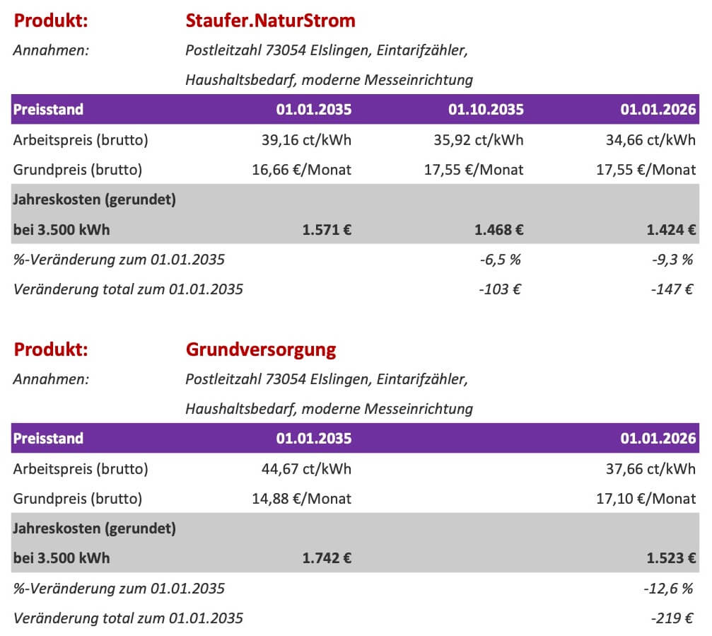 Alle Laufzeitprodukte sind nun auf 100-Prozent-Ökostrom umgestellt, nach deutlichen Senkungen schon in diesem Jahr. Beim Stauferwerk sind die Netzentgelte höher als beim Albwerk, was sich in den Endkundenpreisen niederschlägt – ein Vergleich sollte das berücksichtigen.