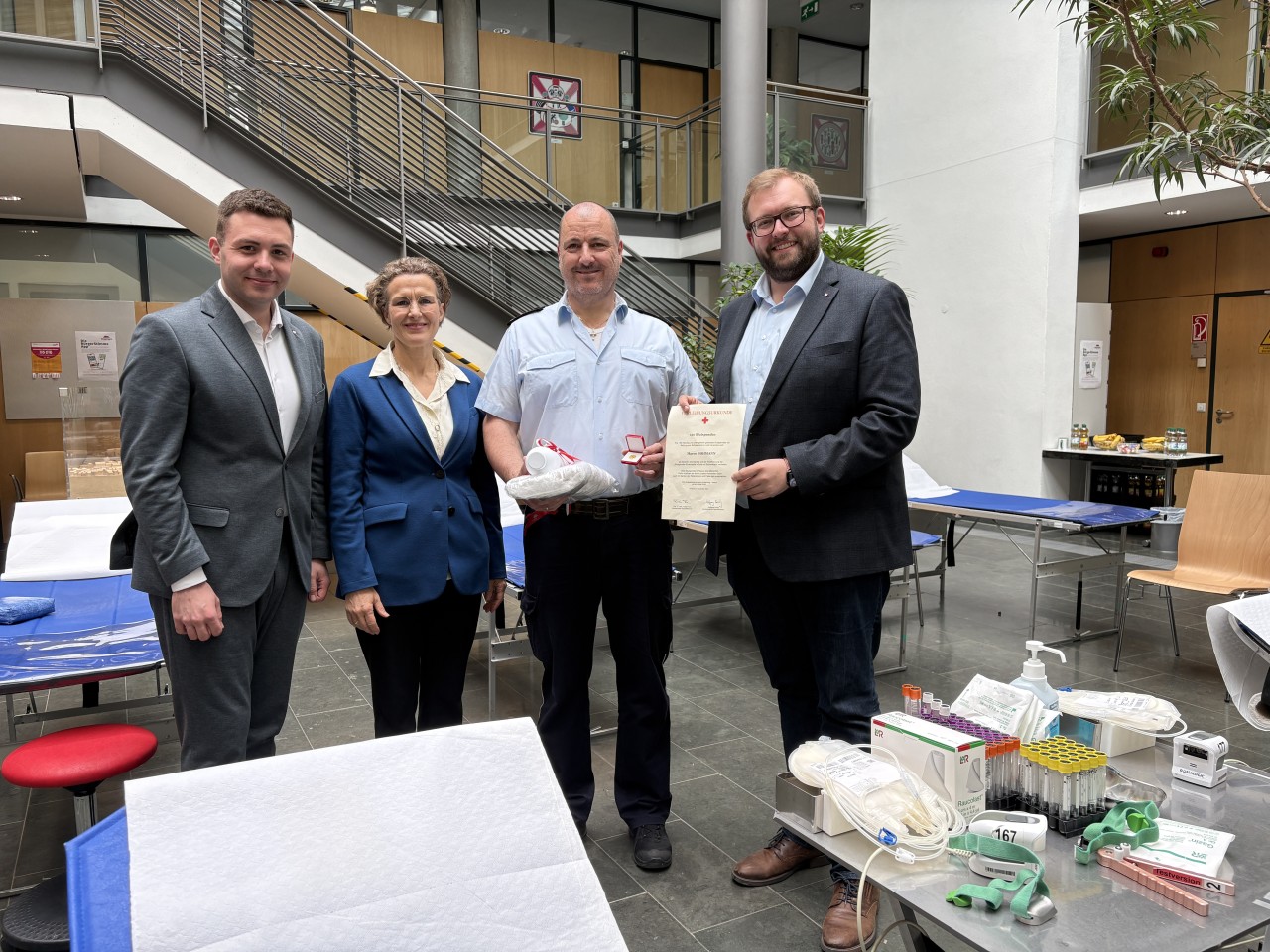 Passend zum Anlass ehrte Maier den städtischen Mitarbeiter vom Gemeindevollzugsdienst Marco Hohmann für insgesamt 150 Spenden. „Das ist äußerst beeindruckend. Wir danken Ihnen für Ihren selbstlosen Einsatz für ihre Mitmenschen“, sagte OB Maier. Marco Hohmann spendet bereits seit seinem 18. Geburtstag regelmäßig Blut – und das sechs Mal im Jahr. Für seinen Einsatz erhielt Hohmann eine Urkunde und die Blutspender-Ehrennadel in Gold mit Eichenkranz.