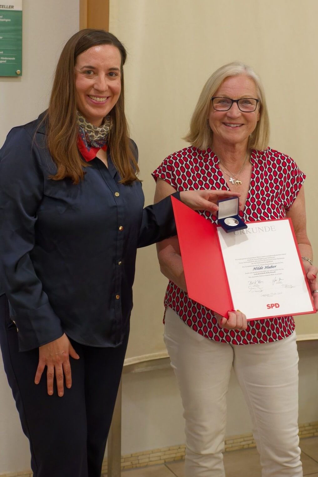 Höhepunkt des Abends war die Verleihung der Willy‑Brandt‑Medaille an Hilde Huber. Mit dieser Auszeichnung würdigt die SPD besondere Verdienste um die Partei. In der Laudatio wurde Hubers langjähriges Engagement, ihr Durchhaltevermögen und ihr unermüdlicher Einsatz für den Ortsverein und die sozialdemokratische Arbeit vor Ort hervorgehoben.