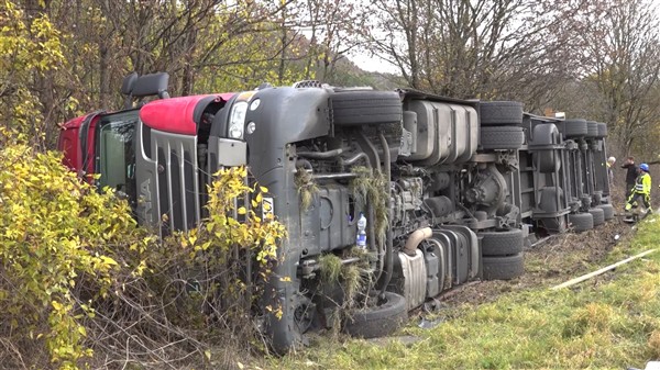 Gruibingen/A8: LKW kippt um und landet im Graben