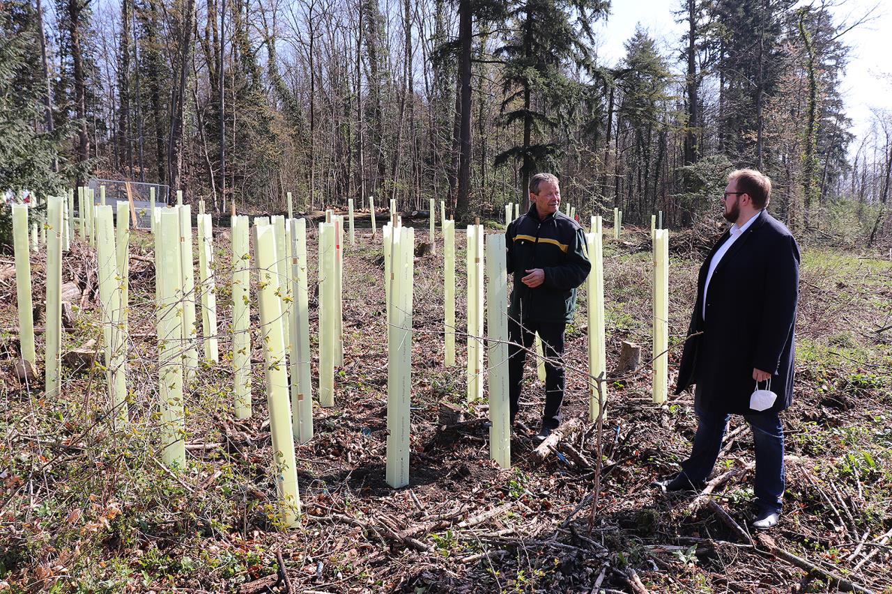Am vergangenen Donnerstag besuchte Oberbürgermeister Alex Maier gemeinsam mit Forstrevierleiter Reiner Ertl eine Aufforstungsmaßnahme im Oberholz. Unweit der Bartenhöhe werden derzeit auf einer Fläche von rund 1,3 Hektar rund 500 robuste Jungbäume gepflanzt, überwiegend Eichen mit Beimischung von Nuss- und unterschiedlichen Wildobst-Arten. Diese klimastabilen Bäume können sich den veränderten klimatischen Bedingungen, wie zum Beispiel den immer länger werdenden Trockenzeiten, besser anpassen.