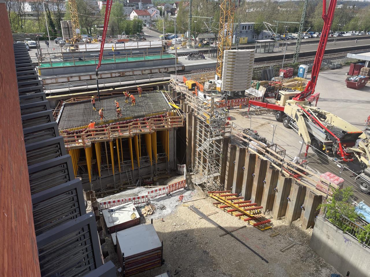 Die ersten beiden von insgesamt neun Bauwerksblöcken sind fertig. Diese stehen nun seitlich neben den Gleisen und werden mit Hydraulikpressen unter die Gleise gezogen. Der erste Block kommt am 06.05.2025 in seine endgültige Position unter die beiden südlichen Gleise. Hierzu wird der ca. 1.200 Tonnen schwere Stahlbetonblock durch sechs Verschublager angehoben, damit er durch die beiden seitlichen Hydraulikpressen mit Hilfe von Zugrohren an seine Endposition gezogen wird. Dabei legt der Block insgesamt 14 Meter zurück. Als Widerlager für die Zugrohre dienen zwei Stahlträger, die in der Mitte der Baustelle ca. 2,5 Meter tief in den Untergrund betoniert sind. Der gesamte Vorgang des Einschubs dauert etwa 3 Stunden.