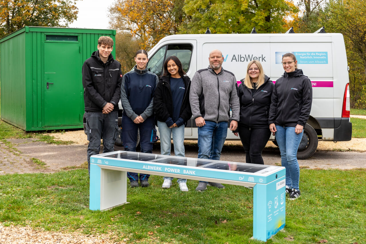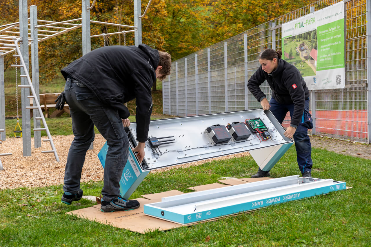 Die multifunktionale, solarbetriebene Sitzbank mit USB- und Induktionsladefunktionen sowie einem WLAN-Hotspot wurde Mitte Oktober nahe der Calisthenics-Anlage installiert. Die vollständige Planung und Umsetzung des Projekts erfolgte in Teamarbeit durch gewerbliche und kaufmännische Auszubildende des Albwerks. Während die Nachwuchskräfte aus dem gewerblichen Bereich technische Aufgaben wie Montage, Programmierung und Installation verantworteten, übernahmen die kaufmännischen Auszubildenden die Organisation sowie die mediale Begleitung, etwa bei einem Fotoshooting und dem Erstellen von Inhalten für Social Media.