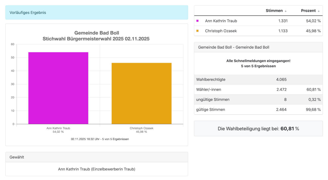 Die Wahlbeteiligung lag in Bad Boll bei 60,81%.