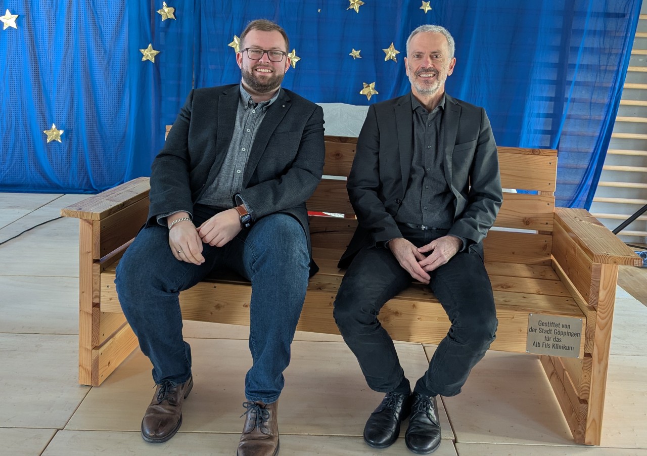 Die Bank ist Anfang dieser Woche übergeben worden. Mit dabei waren Oberbürgermeister Alex Maier sowie der kaufmännische Geschäftsführer des Alb-Fils-Klinikums Wolfgang Schmid. „Als Zeichen unserer Wertschätzung übergeben wir diese Bank an das Klinikum. Sie soll alle Besucher, Patienten und Mitarbeitende zum Verweilen einladen“, sagte Maier und nahm schon einmal zur Probe Platz auf der Bank.