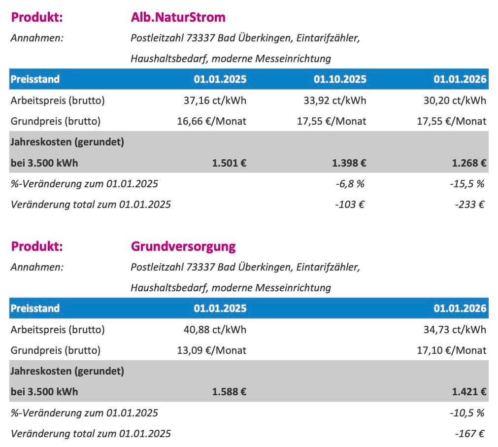 Alle Laufzeitprodukte sind nun auf 100-Prozent-Ökostrom umgestellt, nach deutlichen Senkungen schon in diesem Jahr. Beim Stauferwerk sind die Netzentgelte höher als beim Albwerk, was sich in den Endkundenpreisen niederschlägt – ein Vergleich sollte das berücksichtigen.