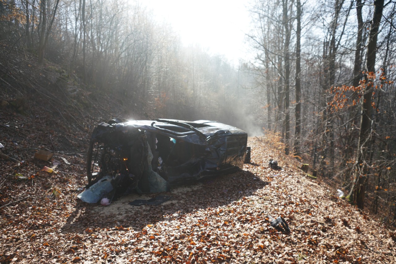 Ulm (ots) - Der Unfall ereignete sich gegen 7.40 Uhr. Der Kleintransporter fuhr von Stötten in Richtung Geislingen. Bei Nebel war der 23-jährige Fahrer wohl mit nicht angepasster Geschwindigkeit unterwegs. In einer Linkskurve geriet er nach rechts gegen die Leitplanken und der Transporter durchbrach diese. Der Transporter flog einen Abhang hinunter und blieb auf einem Nebenweg stehen. Der nicht angeschnallte 21-jährige Beifahrer wurde aus dem Fahrzeug geschleudert. Der Fahrer konnte sich selbst aus dem Auto befreien. Der 21-Jährige erlitt schwere, der 23-Jährige leichte Verletzungen. Mit zwei vor Ort befindlichen Rettungshubschraubern kamen die Männer in Krankenhäuser. Die Kreisstraße war bis 10.50 Uhr voll gesperrt. Der Sachschaden wird auf etwa 30.000 Euro geschätzt.