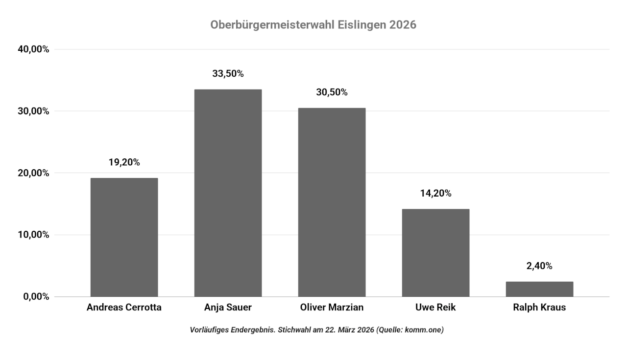 Das Wahlergebniss vom Sonntag zur Oberbürgermeisterwahl in Eislingen/Fils steht fest. Es kommt in 14 Tagen, am 22. März 2026, zu einer Stichwahl zwischen Anja Sauer und Oliver Marzian