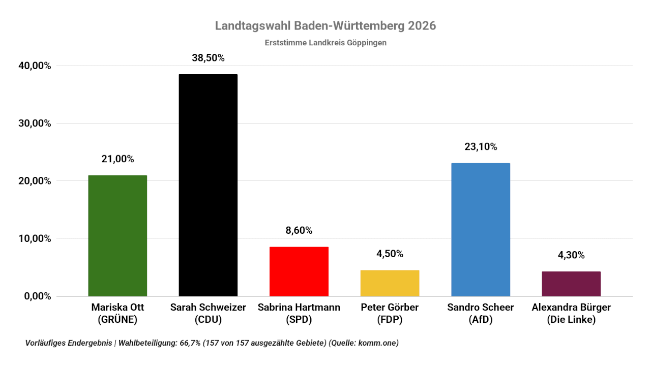 Vorläufiges Endergebnis der Landtagswahl in Baden-Württemberg im Wahlkreis Göppingen: