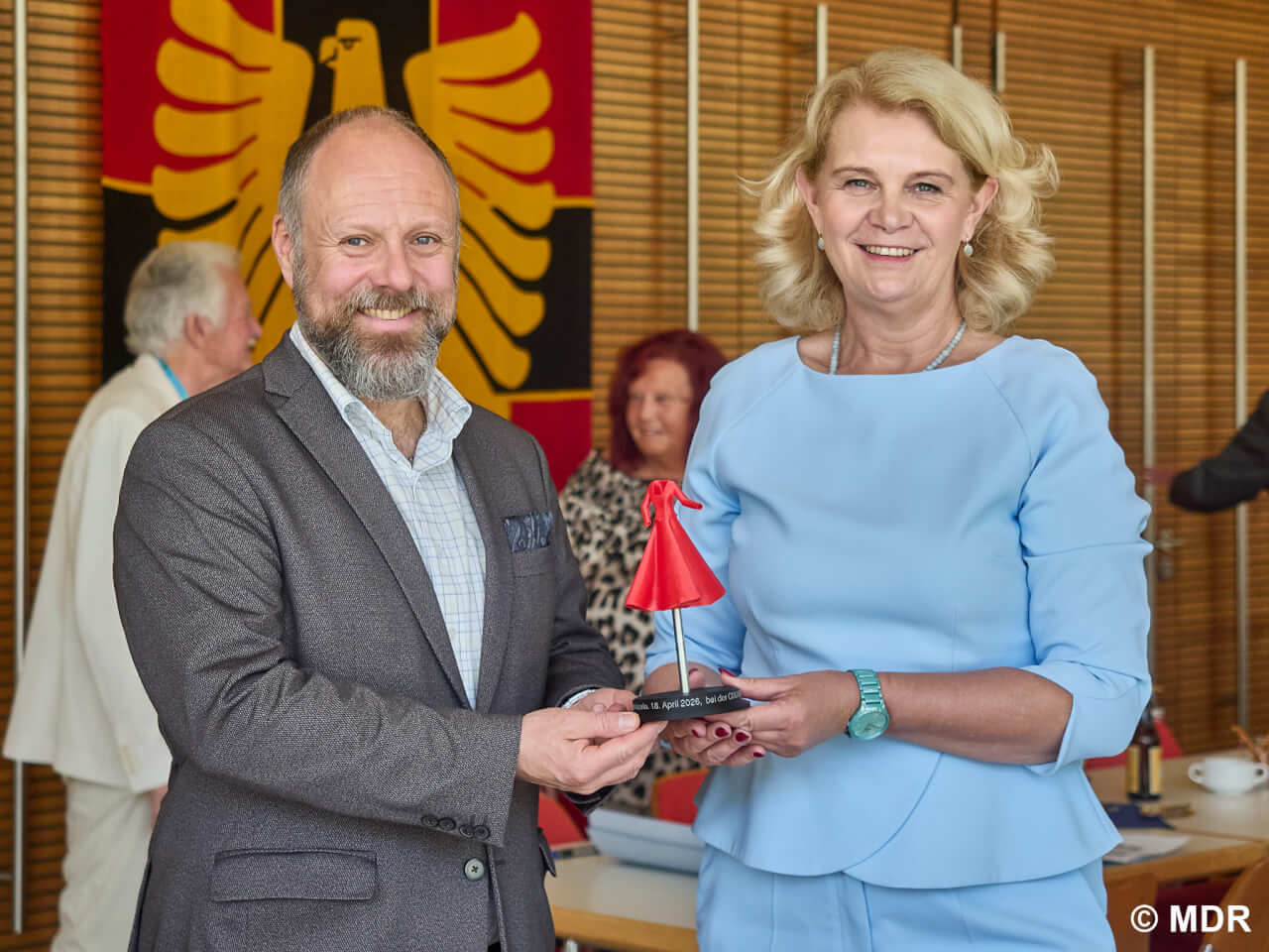 Dass ihr Auftritt mehr war als ein routinierter Pflichttermin, zeigte sich auch abseits der Rede. Persönliche Gesten verliehen dem Besuch eine ganz besondere Note: Für den scheidenden Oberbürgermeister Klaus Heininger brachte sie ein individuell gewidmetes Buch mit, das sie im Beisein seines Vorgängers Günther Frank an Heininger überreichte. CDU-Stadtverbandschef Axel Raisch erhielt Produkte aus ihrer eigenen Imkerei – Honig und Johannisbeerlikör.